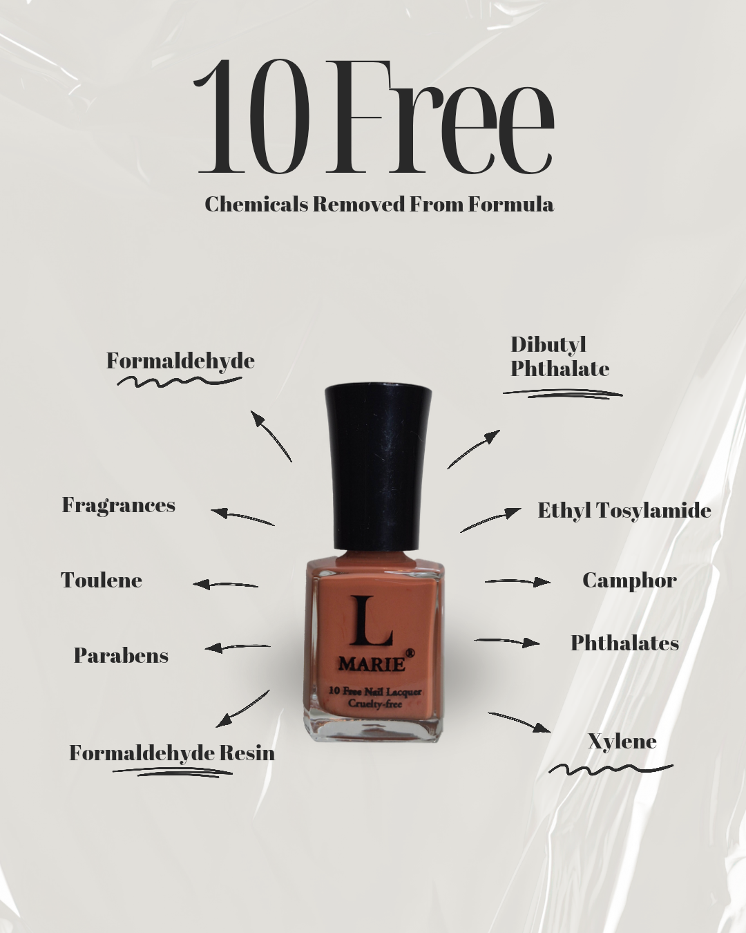 At L’Marie Nail Lacquer®, we believe what "isn't" in your polish matters just as much as what is. That’s why our formula is proudly 10-free, meaning we leave out ten of the most commonly used harmful chemicals found in traditional nail polishes.